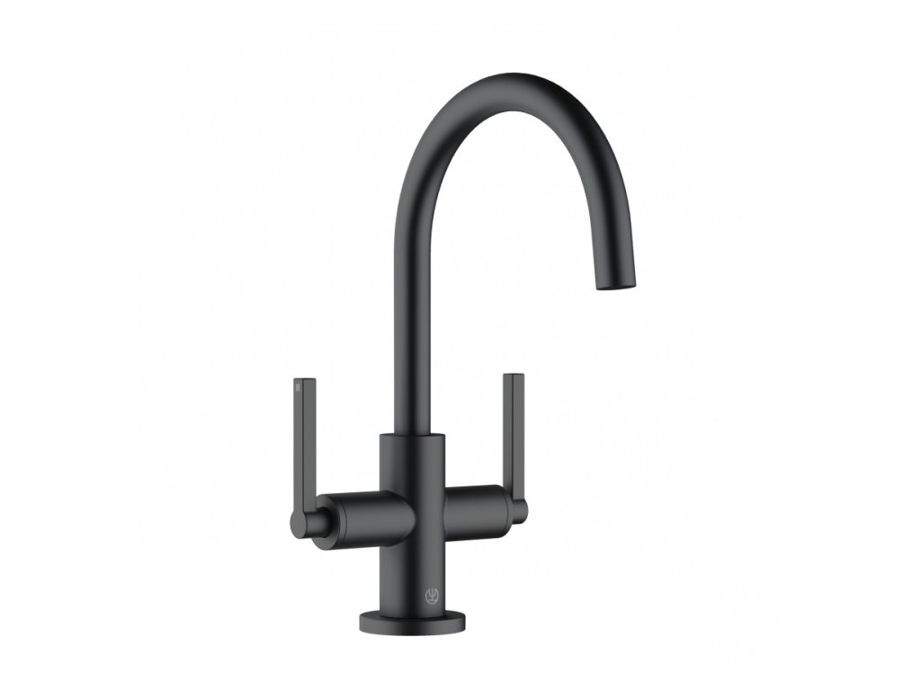 Vodovodná batéria s umývadlovou batériou a výtokom. V čiernej farbe. Prietok batérie je 5,6 l/min. S matným povrchom.