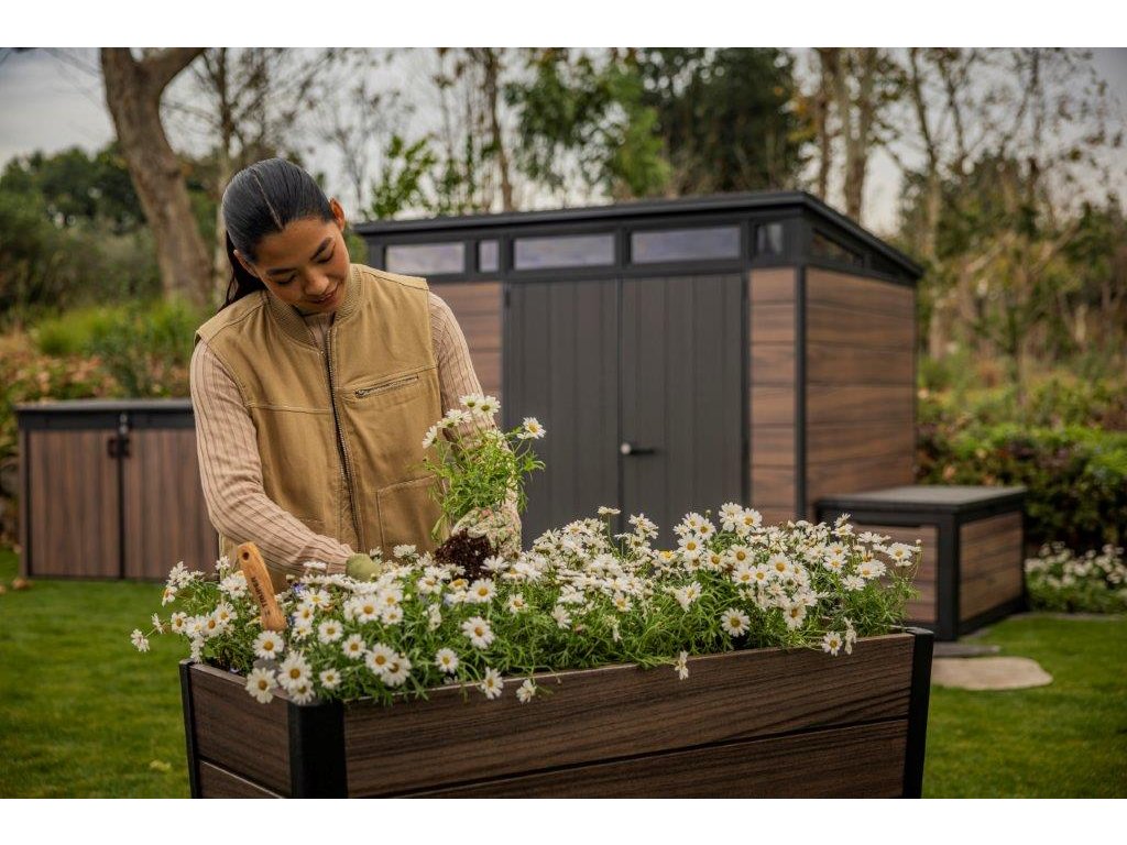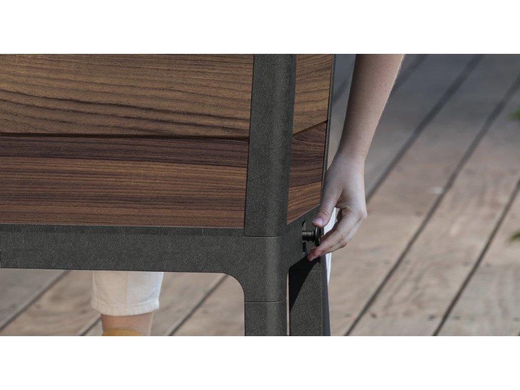 Keter Deco Elevated je vyrobený z odolného plastu s povrchovou štruktúrou imitujúcou drevo, ktorá dokonale ladí s exteriérom. Konštrukcia je stabilná a unesie až 110 kg, takže sa do nej ľahko zmestí väčšie množstvo substrátu. Zavlažovací systém udržiava optimálnu vlhkosť pôdy, čo uľahčuje starostlivosť o rastliny. Vďaka vyvýšenému tvaru koryta nebudete musieť pri práci kľačať ani sa zohýbať. Spodnú policu môžete použiť na uloženie záhradného náradia alebo kvetináčov.