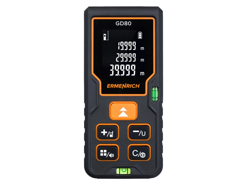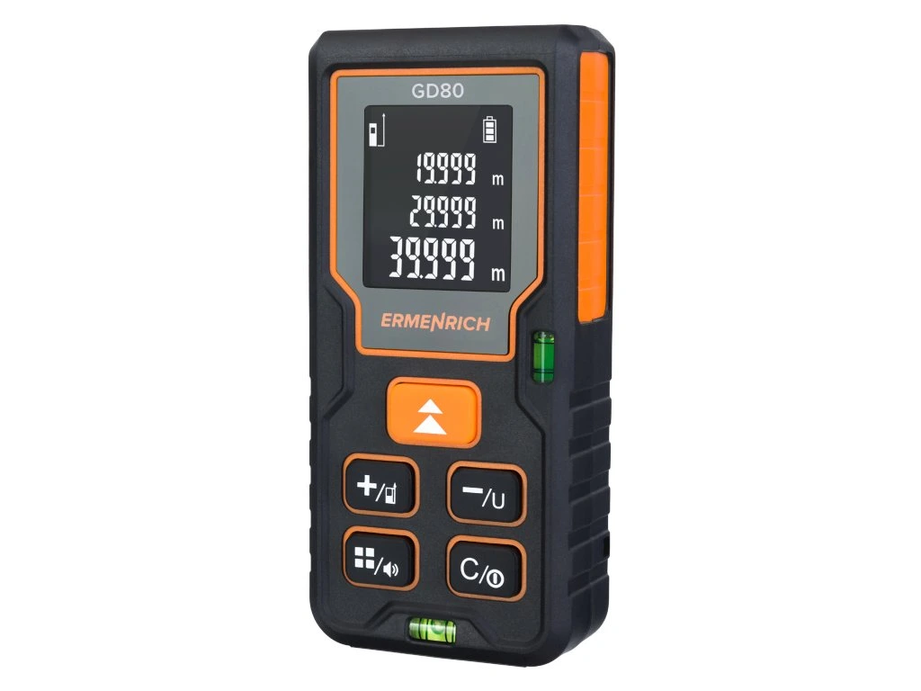 Laserový merací prístroj Ermenrich Reel GD80 využijete na presné meranie na stavbách, pri renováciách, geodetických prácach a úprave obrobkov. S týmto praktickým prístrojom môžete merať vzdialenosti až do 80 metrov. Okrem tejto funkcie môžete ľahko určiť aj plochu a objem miestnosti alebo bazéna.