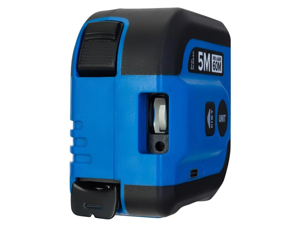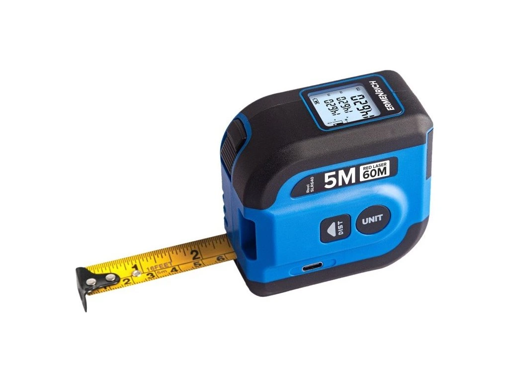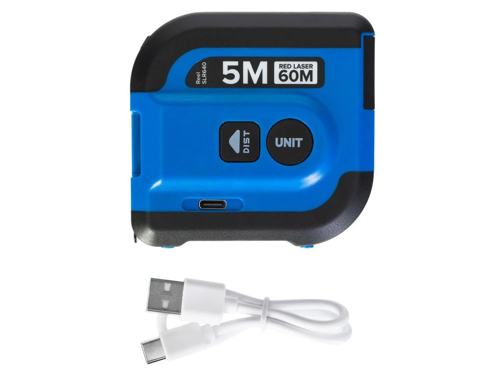 Zariadenie sa môže používať ako bežný 5 m rolovací merač alebo ako laserový merač. Meria až do vzdialenosti 60 metrov a je bezpečný pre vaše oči. Vysokokvalitné vyhotovenie z plastu ABS zaručuje, že zariadenie je odolné voči nárazom. Stupeň krytia IP54 ho chráni pred prachom a striekajúcou vodou. Je napájaný nabíjateľnou batériou.