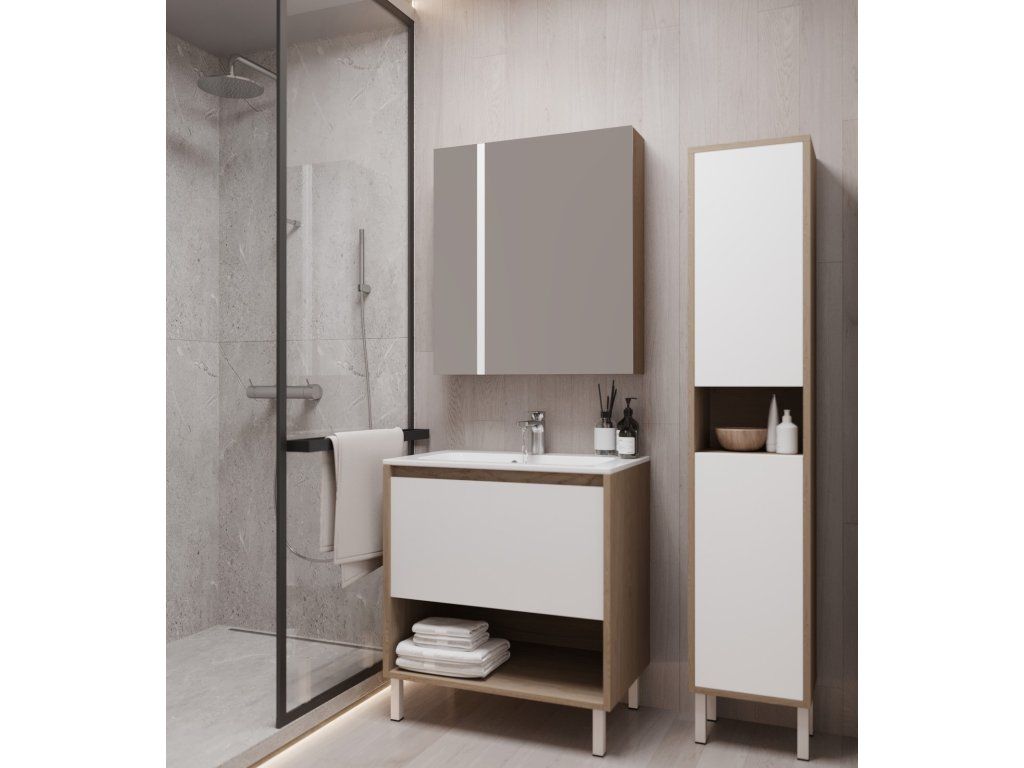 Predstavujeme vám luxusný kúpeľňový nábytok, ktorý zaujme najmä zaujímavým dizajnom. Táto absolútne dizajnová vysoká skrinka by rozhodne nemala chýbať v žiadnej modernej štýlovej kúpeľni. Bočnice skrinky a celá konštrukcia sú vyrobené z MDF dosky s hrúbkou 16 mm. Povrchová úprava je navrhnutá v dekore dreva s bielym moridlom. Veľkou výhodou tejto skrinky je jej tiché zatváranie, vďaka ktorému je používanie skrinky absolútne pohodlné. Pocíťte výhody a úložný priestor, ktorý vám táto skrinka poskytne.