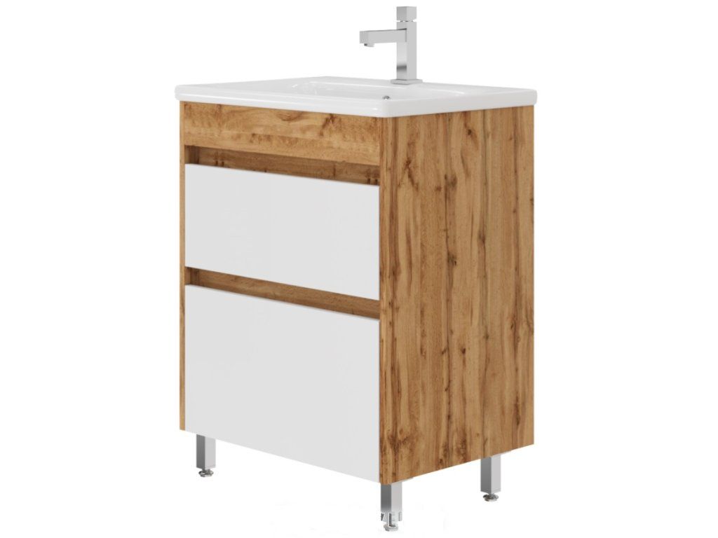 Predstavujeme úplne nový luxusný kúpeľňový nábytok, ktorý poteší každého. Táto absolútne dizajnová skrinka s umývadlom by rozhodne nemala chýbať v žiadnej modernej kúpeľni. Skrinka je vyrobená z drevotrieskovej dosky s hrúbkou 16 mm. Umývadlo, ktoré je súčasťou skrinky, je vyrobené z kvalitnej sanitárnej keramiky. Povrchová úprava je vyhotovená v bielej farbe a v matnom dubovom prevedení. Veľkou výhodou tejto skrinky je jej tiché zatváranie, vďaka ktorému je používanie skrinky absolútne pohodlné. Pocíťte výhody a úložný priestor, ktorý vám táto skrinka poskytne.