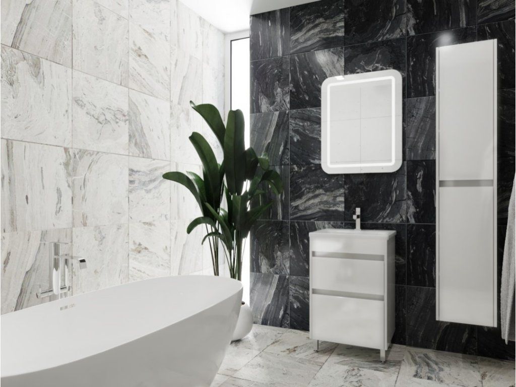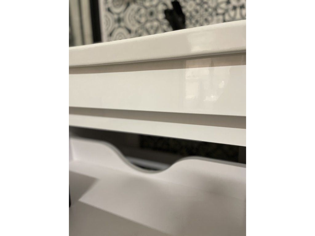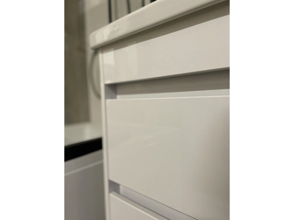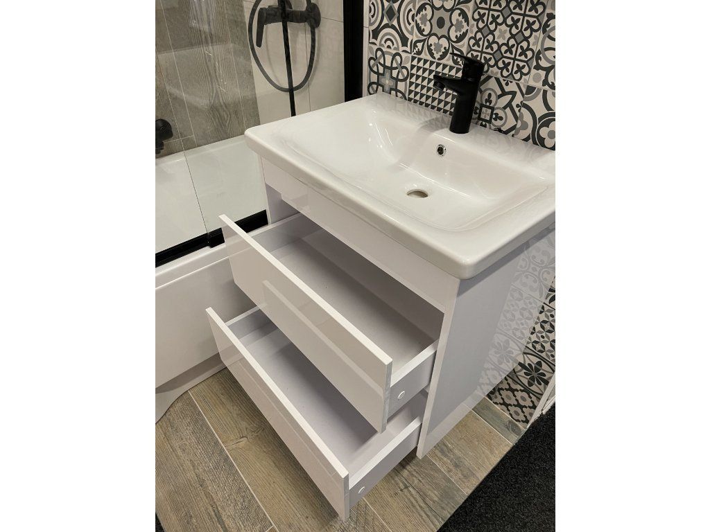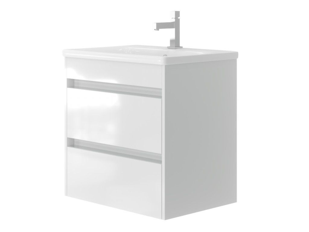 Predstavujeme úplne nový luxusný kúpeľňový nábytok, ktorý poteší každého. Táto absolútne dizajnová skrinka s umývadlom by rozhodne nemala chýbať v žiadnej modernej kúpeľni. Skrinka je vyrobená z drevotrieskovej dosky s hrúbkou 16 mm. Umývadlo, ktoré je súčasťou skrinky, je vyrobené z kvalitnej sanitárnej keramiky. Povrchová úprava je biely lesklý lak. Veľkou výhodou tejto skrinky je jej tiché zatváranie, vďaka ktorému je používanie skrinky absolútne pohodlné. Pocíťte výhody a úložný priestor, ktorý vám táto skrinka poskytne.