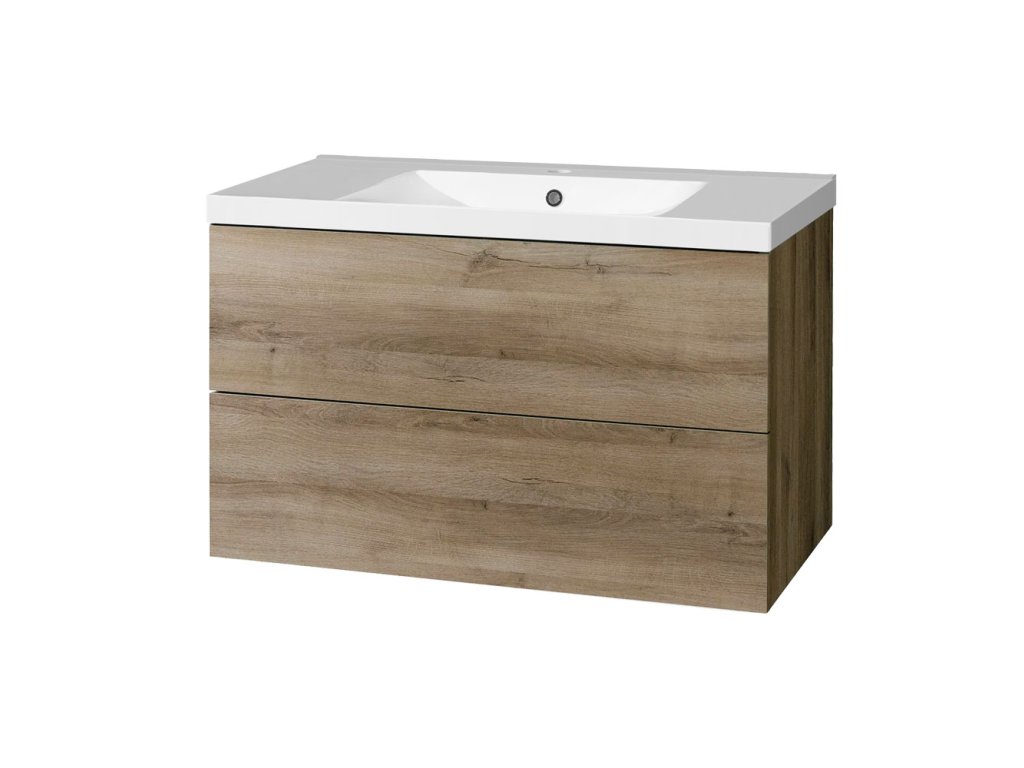 Aira, kúpeľňová skrinka s umývadlom z liateho mramoru 1010x578x465 mm, spodná, dub Halifax, 2 zásuvky, push-open systém a pomalé dovieranie.