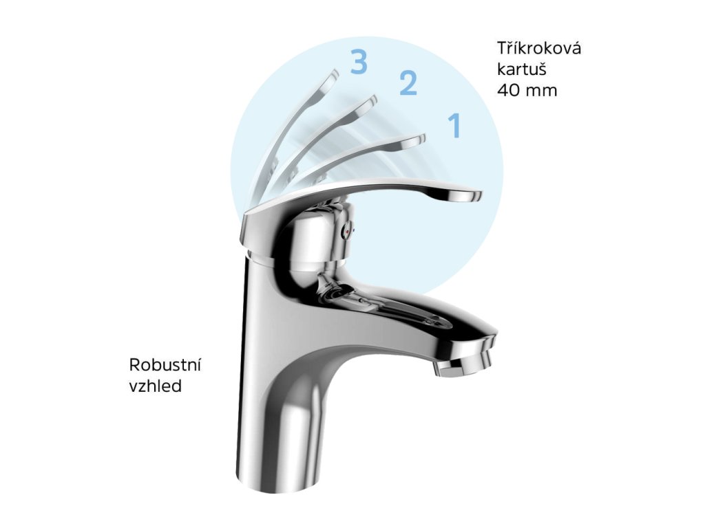 Oblý robustný design, bez výpuste, trojkroková kartuša pre zníženú spotrebu vody. Inovatívny design s prelomovou technológiou výkyvným perlátorom +-7°