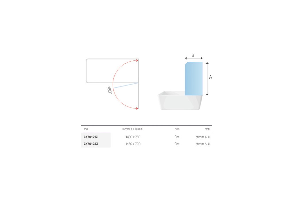 Váňová zástena je dodávaná s robustnými profilmi, bezpečnostným sklom zvislým zdvíhacím pántom.Profil vaňové zásteny je z hliníkového profilu, vo farebné úprave leštený hliník. Ako výplň je dodávané 6 mm silné bezpečnostné sklo, v dizajnu Číre.