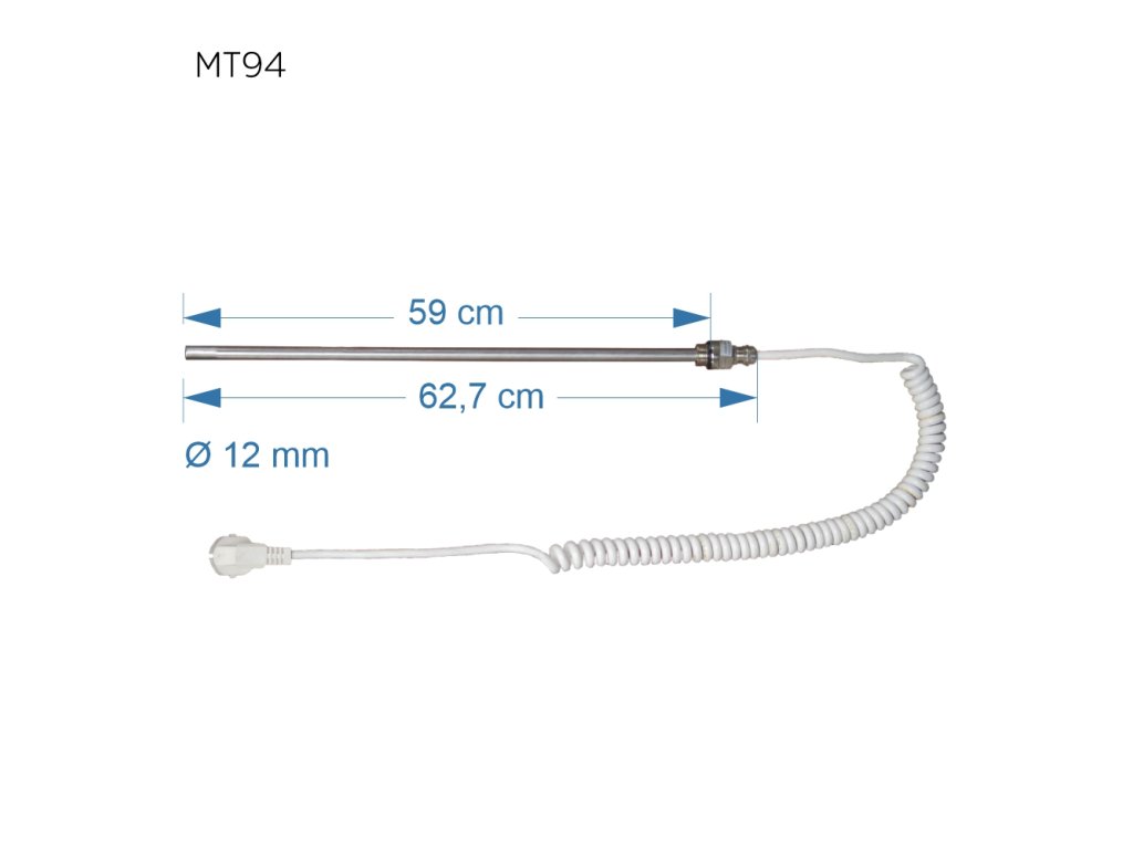 Elektrická vykurovacia tyč bez termostatu slúži k vyhrievaniu kúpeľňových radiátorov - rebríkov. Vykurovacia tyč po zapnutí telesa do zásuvky nemá žiadnu reguláciu ani termostat a hreje pokiaľ ju nevypnete. Termostat pod označením MT99 je možné zakúpiť samostatne. Dĺžka káblu u vykurovacej tyče je 120 cm a je zakončená vidlicou s ochranným kolíkom.Dodatočné parametre
