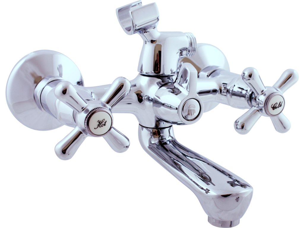 Nástenná vaňová batéria s keramickým prepínačom a vidlicou na uloženie sprchy.