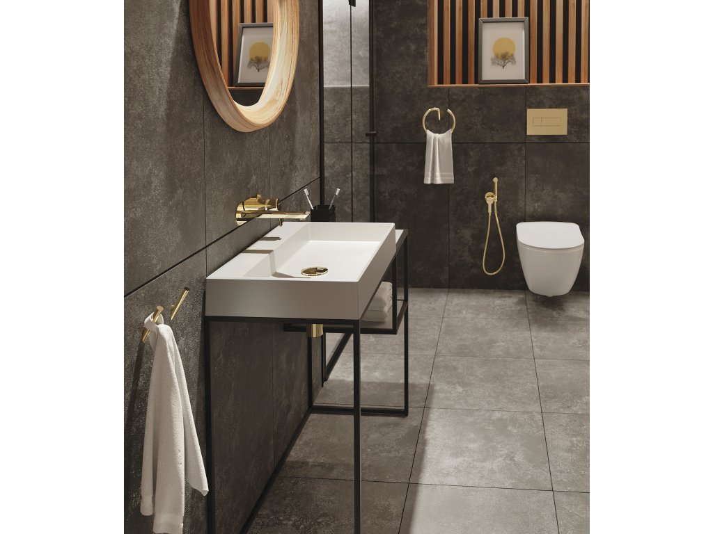Splachovacie tlačidloSlim Goldje veľmi decentné a zároveň dekoratívne. Vďaka modernému vyhotoveniu je vhodné do interiérov zariadených v modernom, škandinávskom alebo minimalistickom štýle. Má dva prevádzkové režimy: na splachovanie s väčším a menším množstvom vody, čo výrazne znižuje účty. Tlačidlo je určené na inštaláciu na skryté rámy. Prvok je veľmi tenký, vďaka čomu takmer splýva s povrchom steny.
