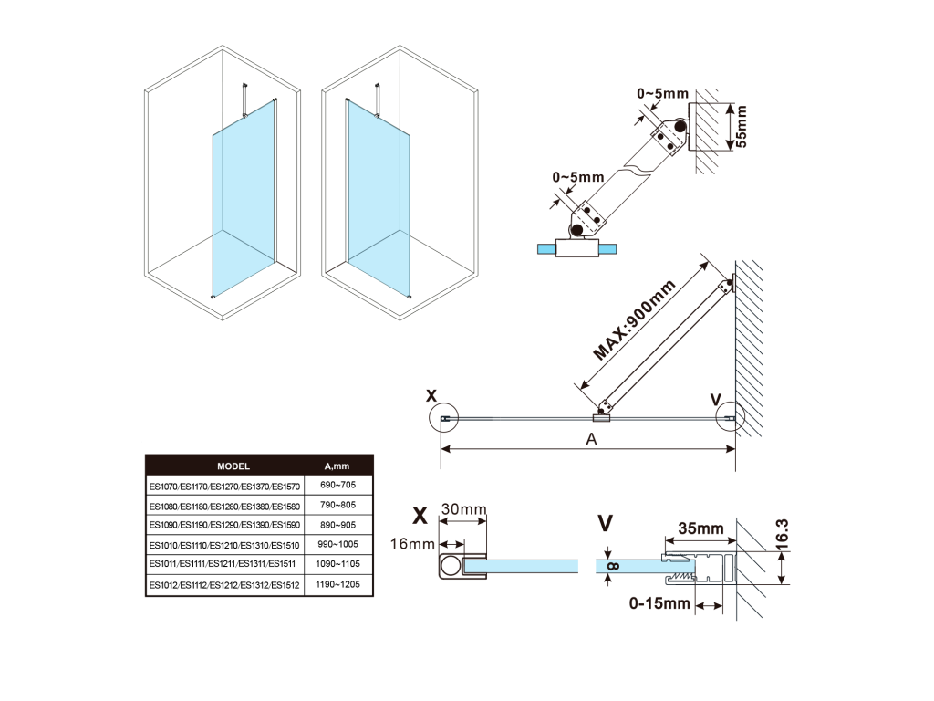 - Stenové profily s toleranciou 15 mm uľahčujú stabilnú inštaláciu zásteny, inštalácia je možná na dlaždice alebo sprchové vaničky