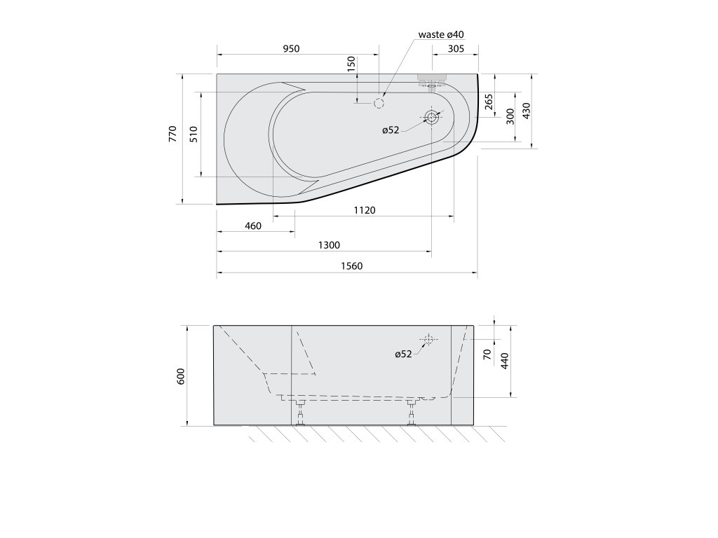 Polysan PROJEKTA L MONOLITH asymetrická stojaca vaňa 156x77x60cm, bielá 20111M