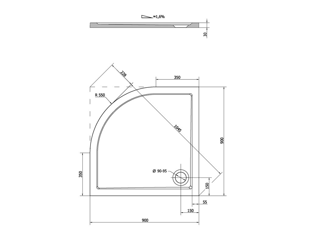 Polysan SERA sprchová vanička z liateho mramoru, štvrťkruh 90x90cm, R550, biela 41511