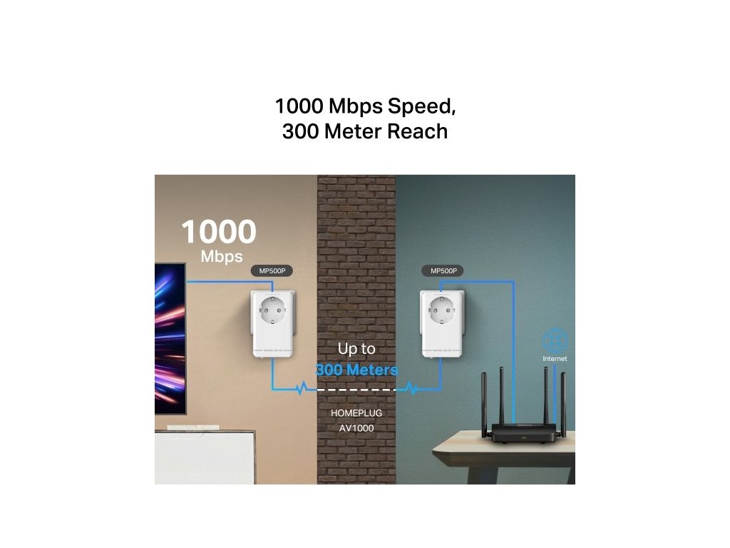 Rozšírte svoju sieť z ľubovoľnej zásuvky - súprava TP-Link Mercusys MP500P Powerline Adapter KIT 2-pack poskytuje rýchly internet bez vŕtania a káblov. Vďaka technológii HomePlug AV2 prenáša dáta rýchlosťou až 1000 Mb/s a pokrýva vzdialenosť až 300 metrov cez existujúce elektrické vedenie.