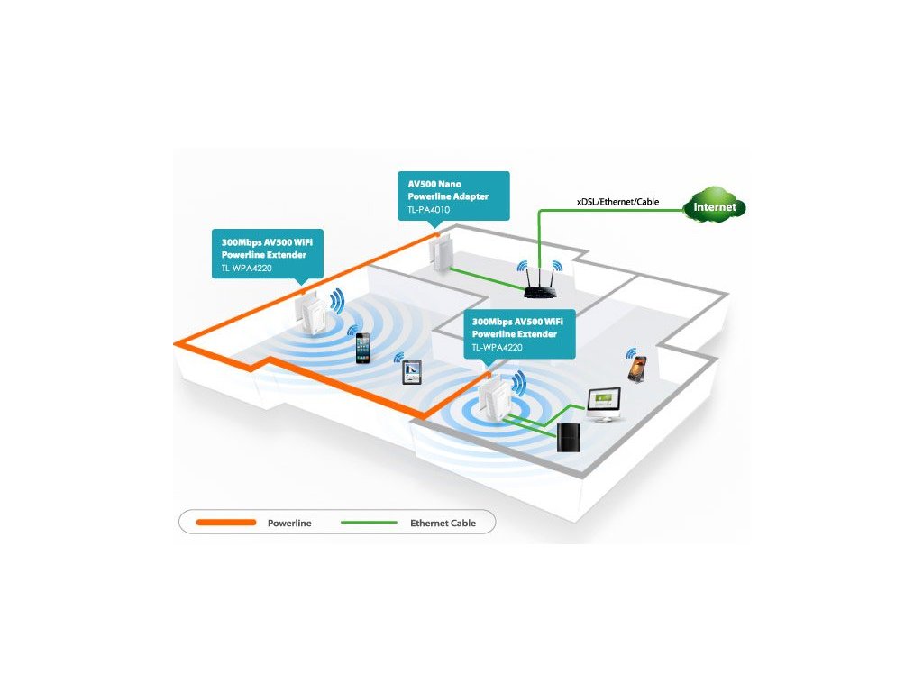 TL-WPA4220 + TL-PA4010 rozšíri vaše internetové pripojenie do každej miestnosti v dome pomocou vašej existujúcej elektrickej siete. Poskytuje vysokorýchlostný prenos dát rýchlosťou až 600 Mbit/s na vzdialenosť až 300 metrov a bezdrôtové pripojenie rýchlosťou až 300 Mbit/s.