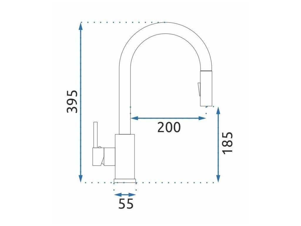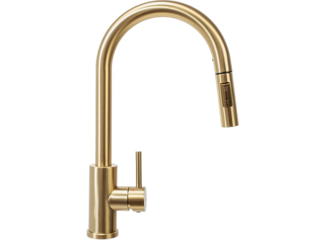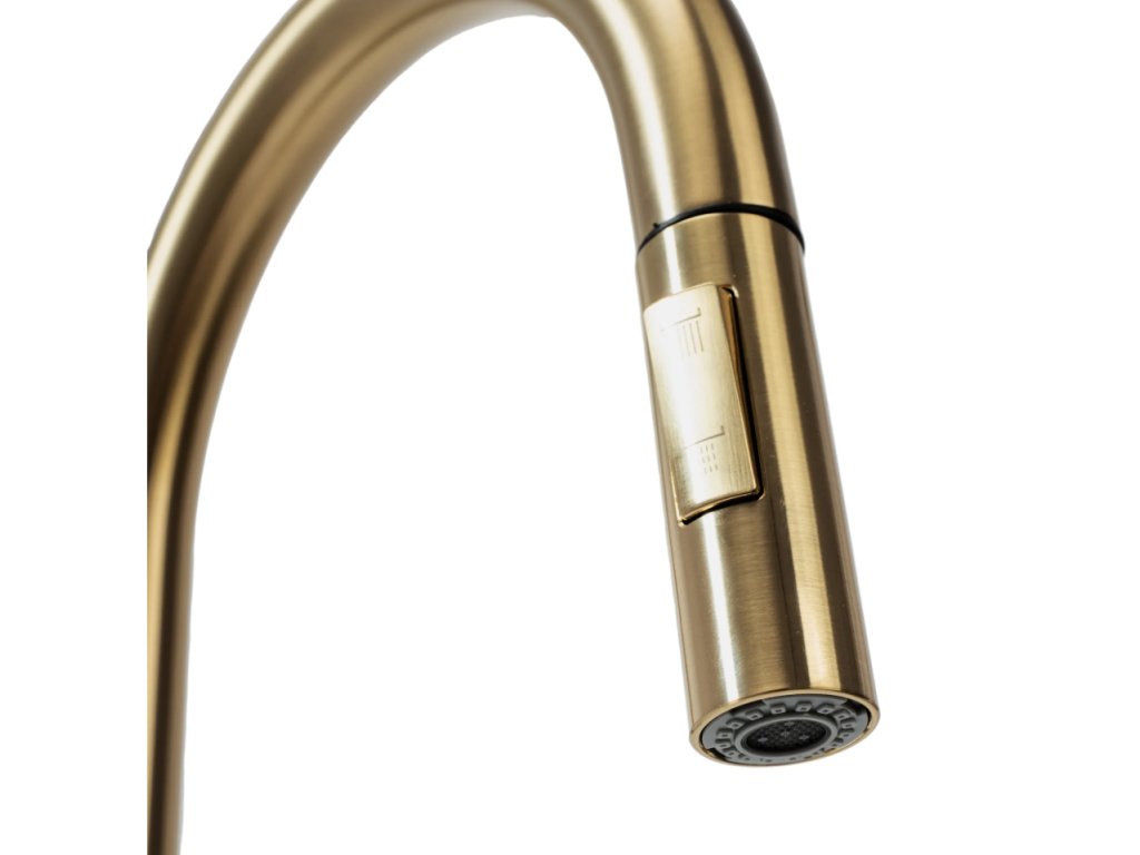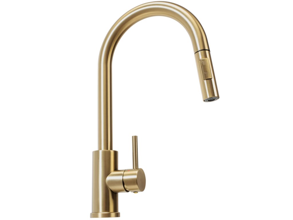 • vysoká drezová batéria s vyťahovacou sprchou v zlatej farbe