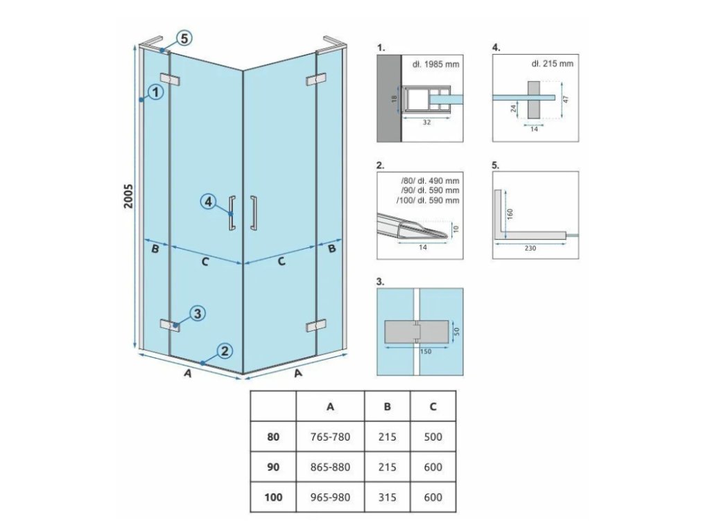 Tabuľka rozmerov sprchového kúta Hugo