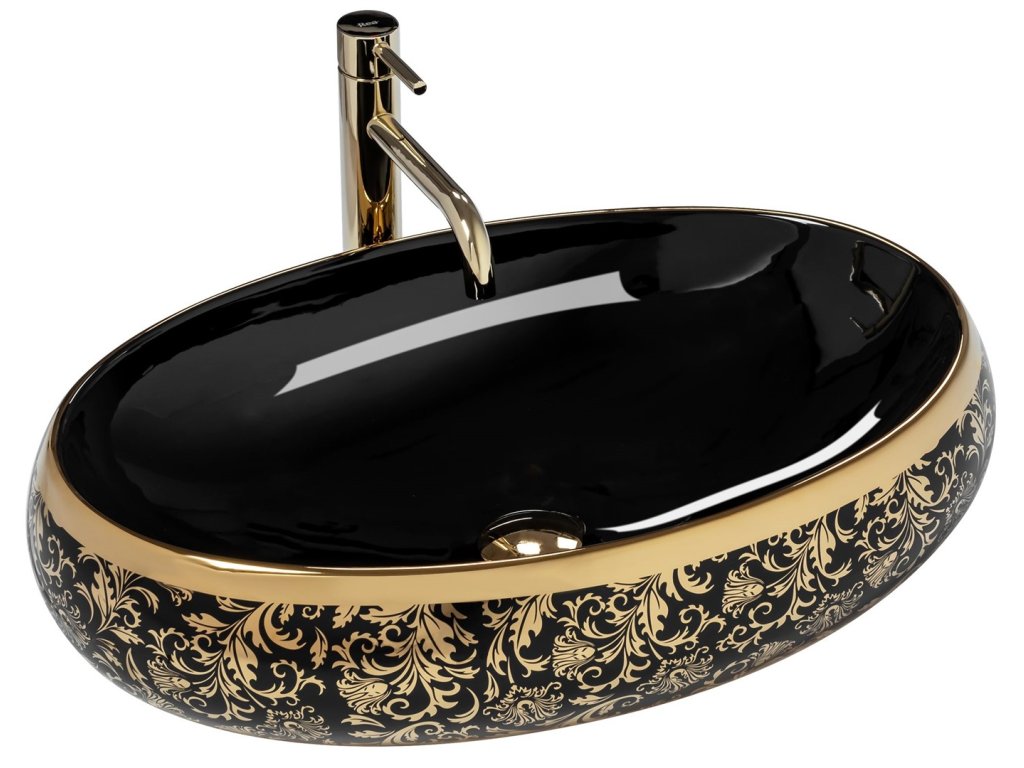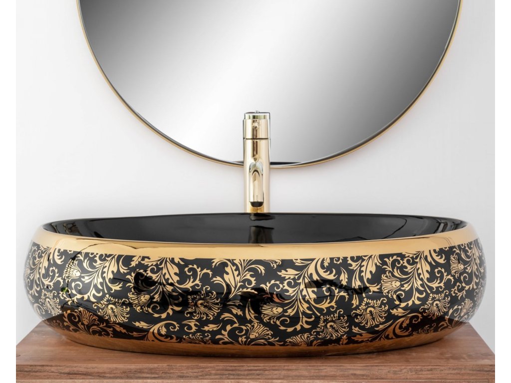 • Umývadlo na dosku vo vysokom čiernom lesku s ozdobným zlatým lemovaním