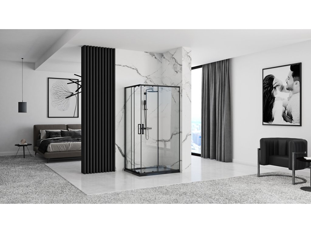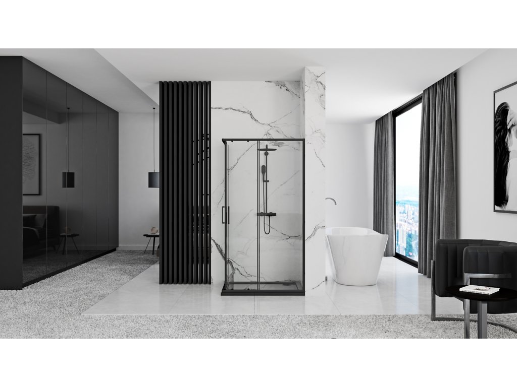 Punto je výrazný, nadčasový a dizajnový sprchový kút, ktorý je vyrobený z najkvalitnejších materiálov. Čierna farba je lídrom na trhu kúpeľňových interiérov, preto čierne profily dodávajú tomuto kútu ten správny nádych modernosti. Sklo je odolné voči nečistotám, škvrnám a ľahko sa čistí. Kombinácia čiernych profilov a čiernych vertikálnych štvorcových úchytiek spolu s priehľadným sklom dokonale ladí s modernou trendovou kúpeľňou. Odporúčame pozrieť si našu ponuku sprchových súprav.