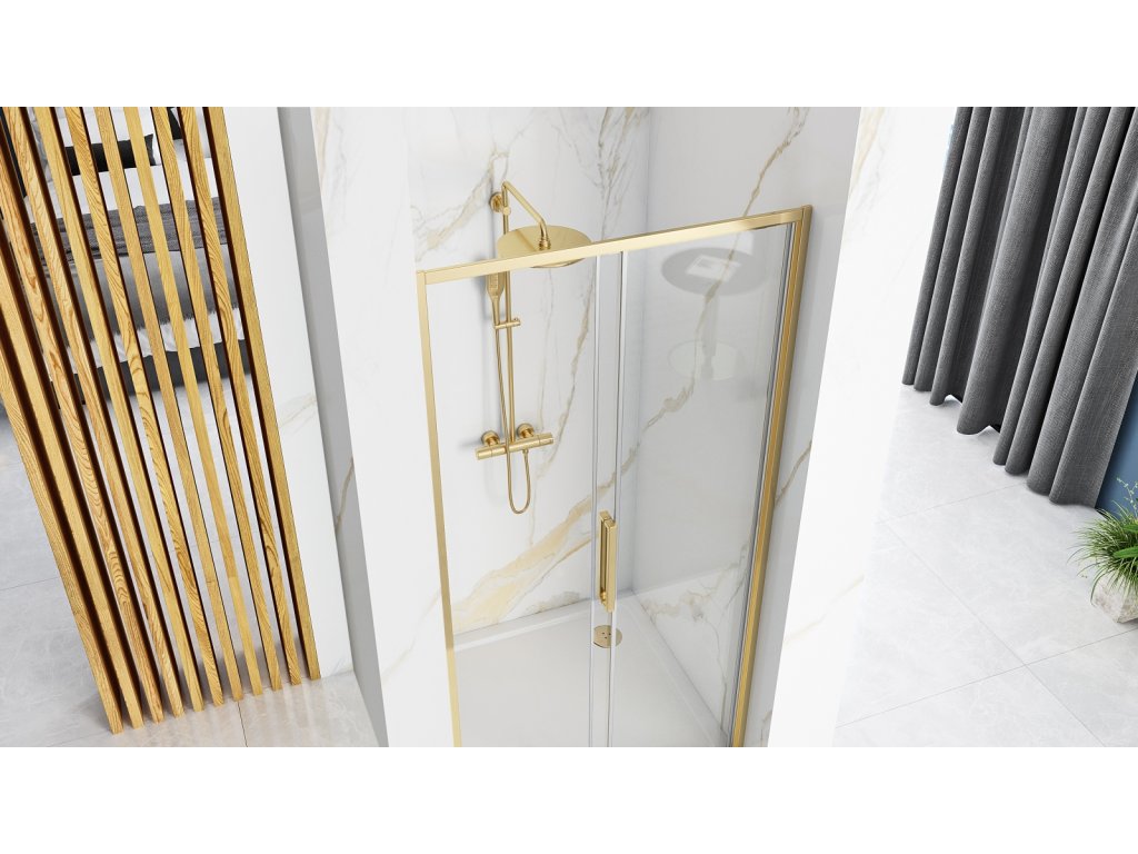 Tieto sprchové dvere vyrobené z najlepších materiálov oslovia každého, kto má rád dizajn. Zaručujú príjemný a bezproblémový prechod do sprchového kúta. Zlaté profily sú odolné voči nečistotám, škvrnám a ľahko sa čistia. Kombinácia chrómových profilov a chrómových madiel spolu s priehľadným sklom dokonale ladí s modernou trendovou kúpeľňou. Pozrite si aj našu ponuku sprchových súprav.