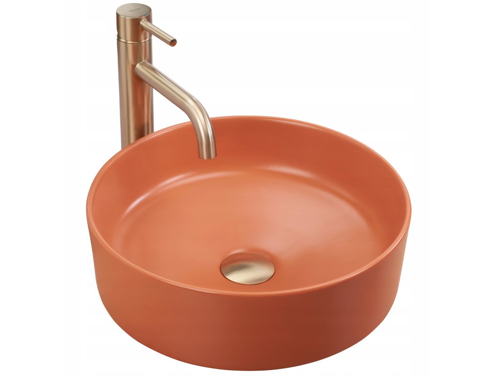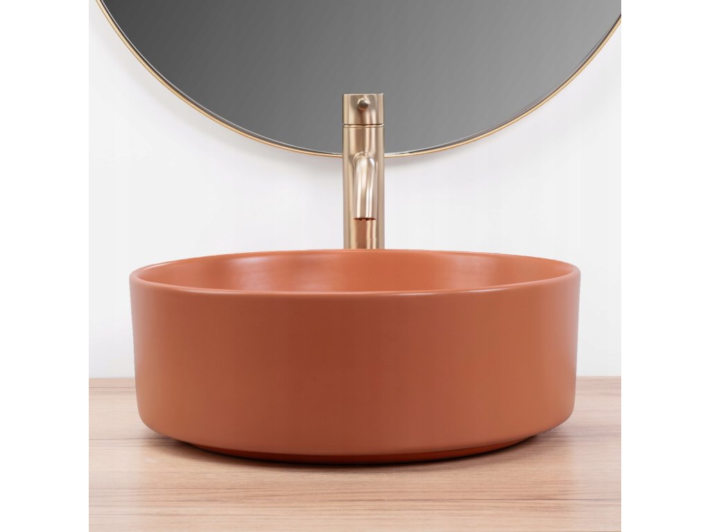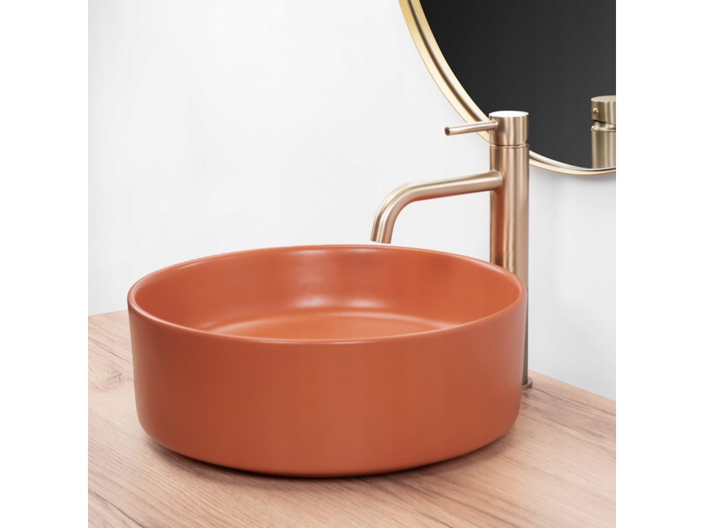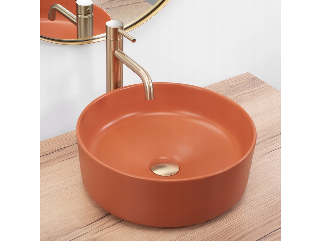 Veľmi moderné a dizajnové umývadlo Sami na dosku v oranžovej matnej farbe. Umývadlo je vyrobené z kvalitnej sanitárnej keramiky. Vďaka špeciálnej povrchovej úprave sa veľmi ľahko čistí a jeho údržba sa stáva jednoduchou.
