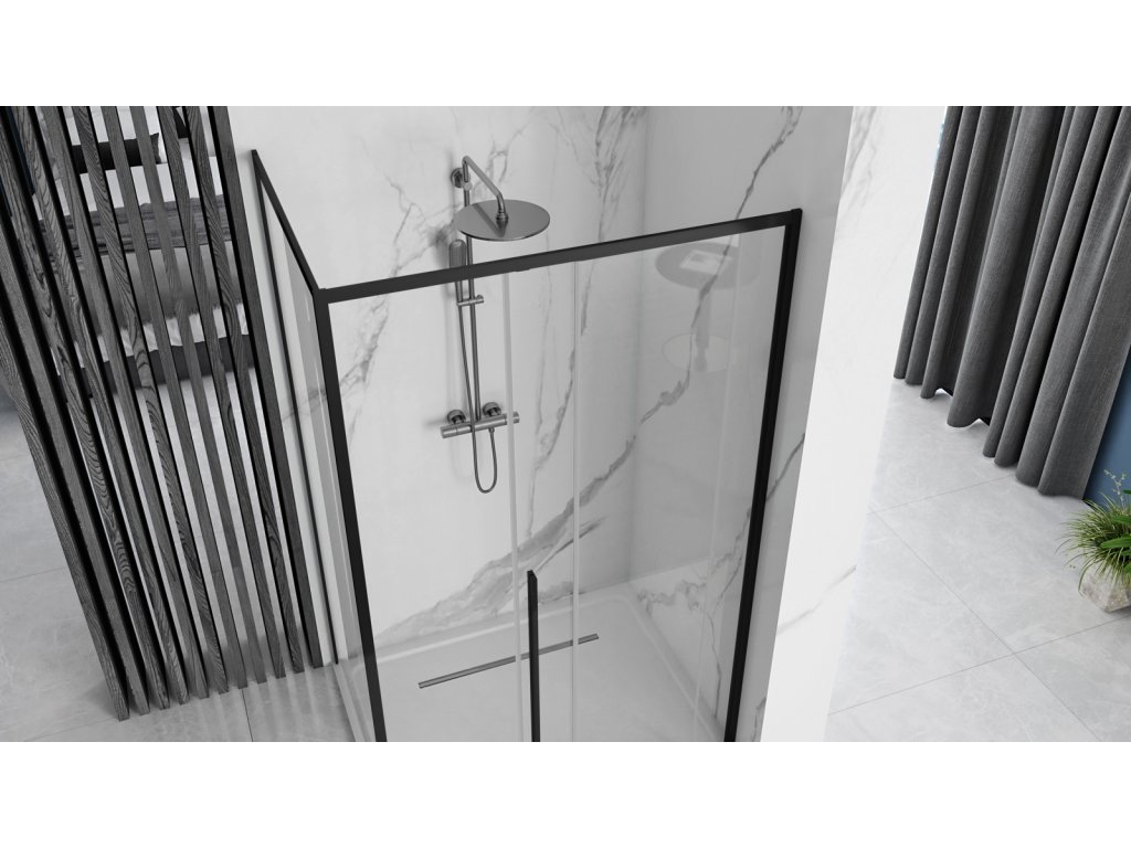 Tento rozmer je najpredávanejší a najbežnejší sprchový kút. Poskytne dostatok priestoru na pohodlné sprchovanie a zároveň nie je taký náročný na priestor kúpeľne. Solar je výrazný, nadčasový a dizajnový sprchový kút, ktorý je vyrobený z tých najkvalitnejších materiálov. Čierna farba je hlavným lídrom na trhu s kúpeľňovými interiérmi, takže jej matné čierne profily dodávajú kútu ten správny nádych modernosti. Sklo je odolné voči nečistotám, škvrnám a ľahko sa čistí. Kombinácia čiernych profilov a čiernych vertikálnych štvorcových úchytiek spolu s priehľadným sklom dokonale ladí s modernou trendovou kúpeľňou.