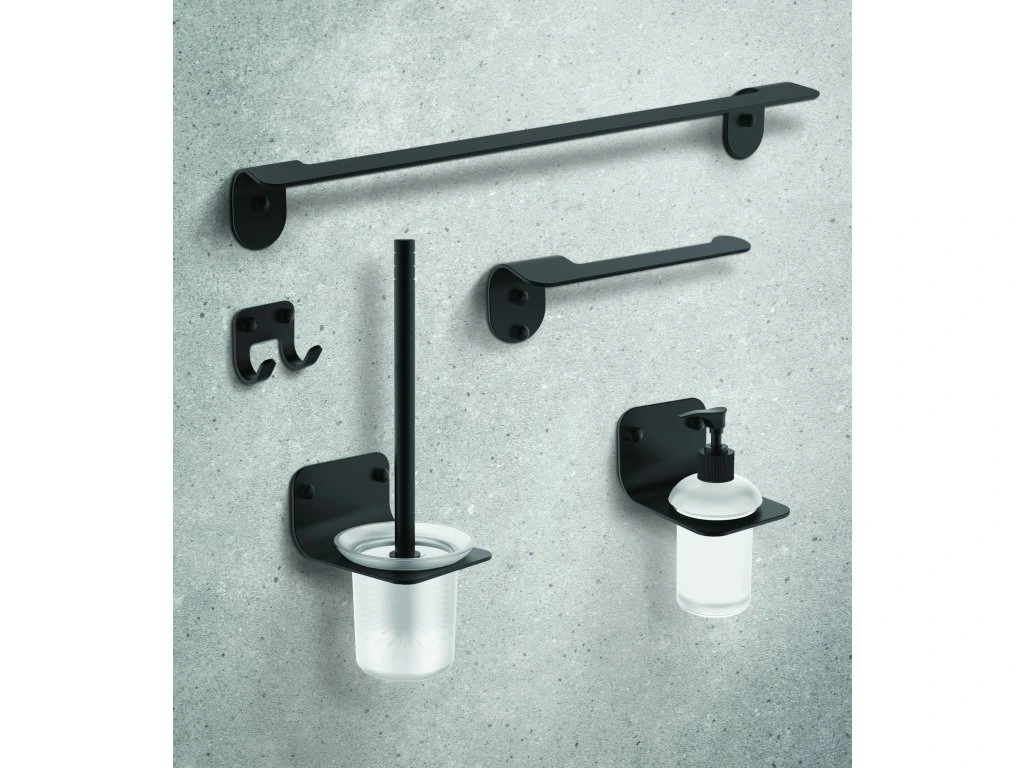 Kúpeľňový set ALTO je tvorený dávkovačom mydla, WC štetkou , háčikom , držiakom toaletného papiera a držiakom na uteráky.