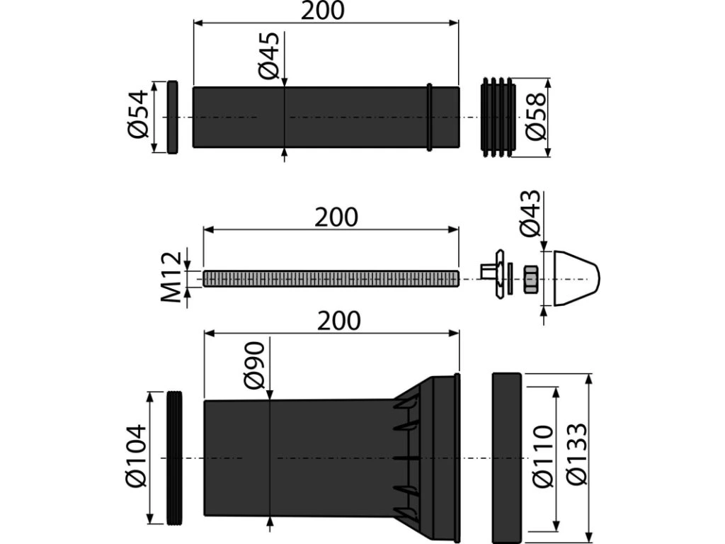 - Rovná výpusť na pripojenie závesnej WC misy k odpadu, polypropylén, Ø 90 mm, vrátane tesnenia