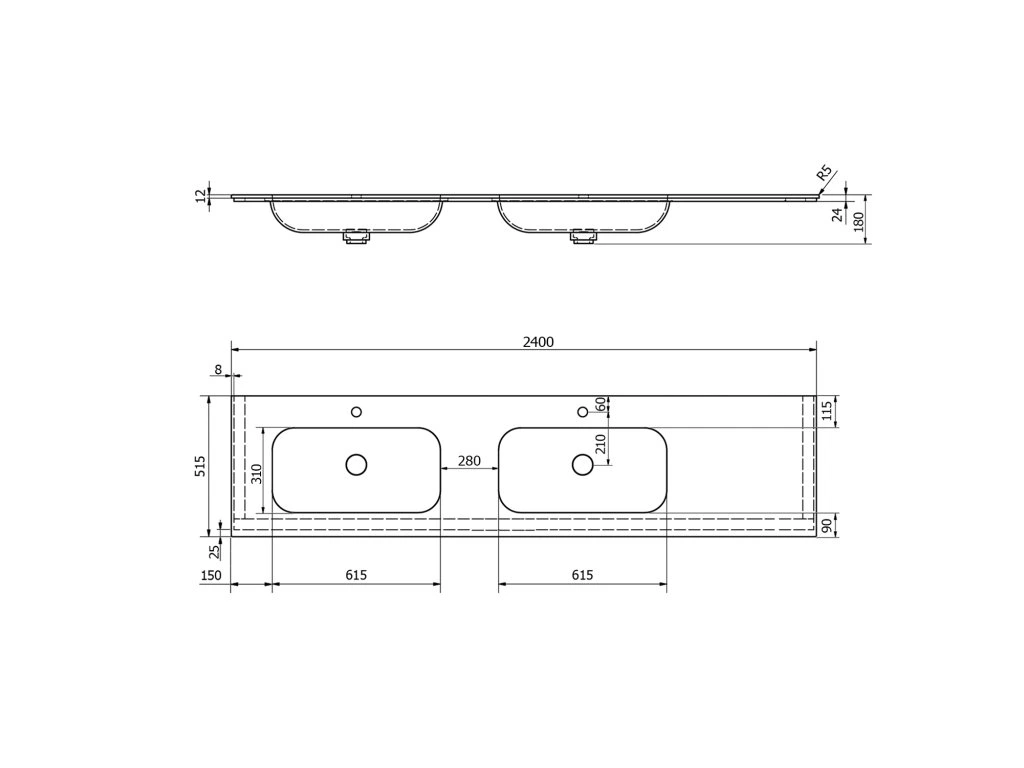 Sapho ARUBA dvojumývadlo vľavo, 240x51,5 cm, Rockstone biela matná AR240-B2L