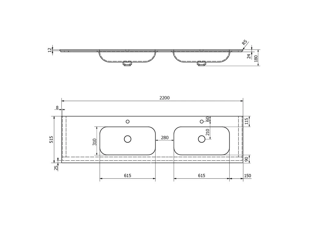 Sapho ARUBA dvojumývadlo vpravo, 220x51,5 cm, Rockstone biela matná AR220-B2R