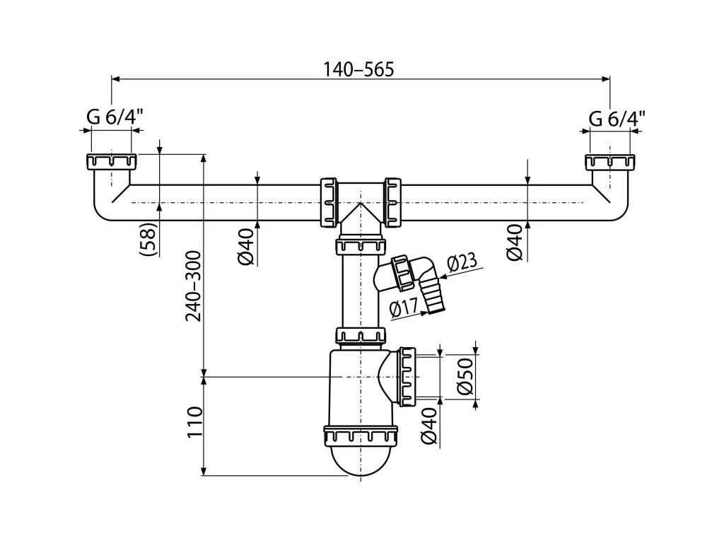 Sifón ALCA pre dva drezy s prevlečnými maticami 6/4" a prípojkou A448P-DN50/40