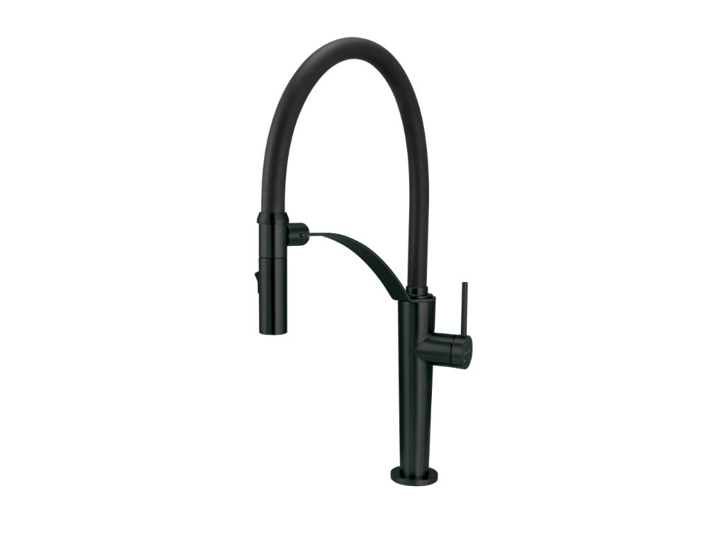 Kuchynská drezová batéria Corda v čiernej farbe zaujme svojím moderným dizajnom a funkčnosťou. Vďaka flexibilnej výpustnej rúre, ktorá sa odkrýva pomocou magnetu, je práca v kuchyni oveľa jednoduchšia. Flexibilná výtoková rúra uľahčuje umývanie veľkých hrncov a plnenie vysokých nádob vodou. Dvojfunkčná rukoväť umožňuje zmenu z prevzdušneného prúdu na dažďovú sprchu, ktorá je ideálna na oplachovanie ovocia a zeleniny. Chrómový povrch dodáva eleganciu a šmrnc a dokonale sa hodí do moderných aj klasických kuchynských interiérov. Dizajn batérie sa dokonale hodí ku granitovým drezom.