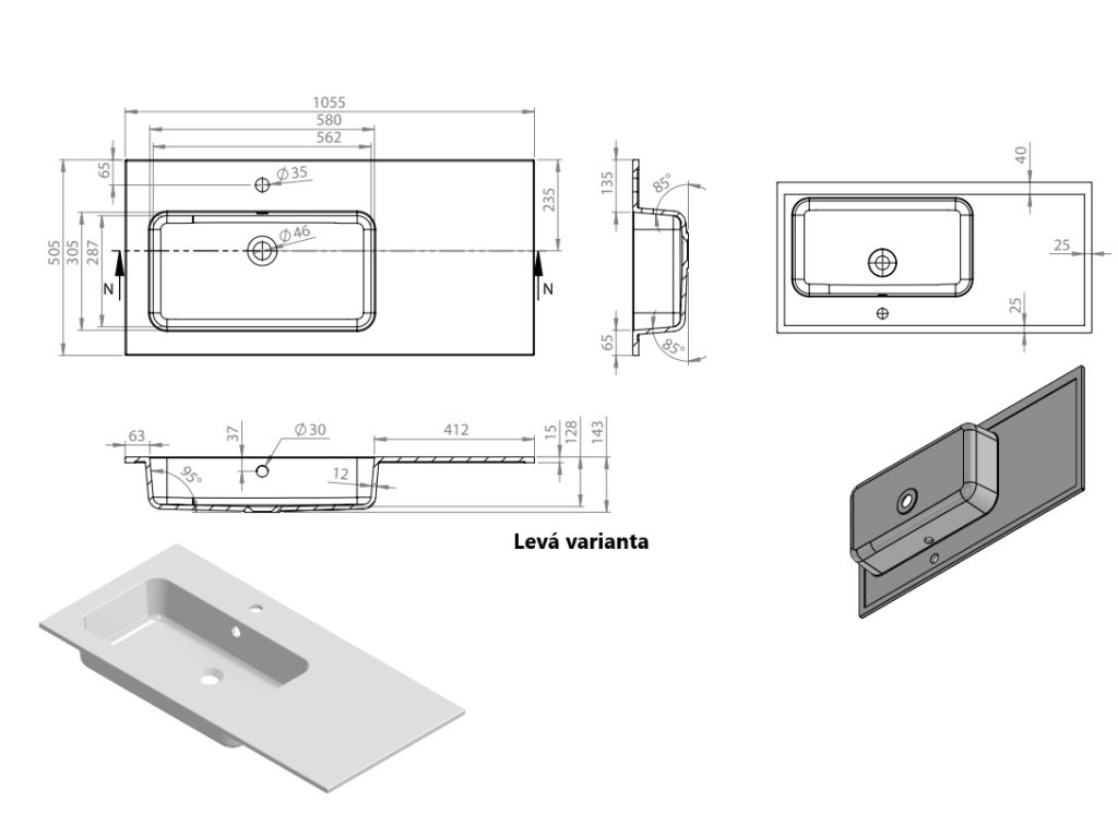 Vayer Tucana L/P 105 umývadlo na dosku, mramor, orientácia: ľavá, TUC_LEV