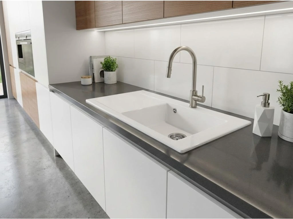 - vysokokvalitný keramický drez vyrobený zo 100 % prírodných surovín