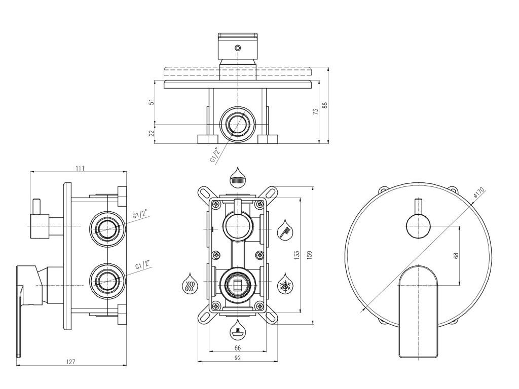 Túto batériu možno použiť buď v sprchovom kúte ako kombináciu troch prvkov, alebo vo vani ako kombináciu napr. prepadu, ručnej a hlavovej sprchy alebo výtoku, ručnej a hlavovej sprchy.