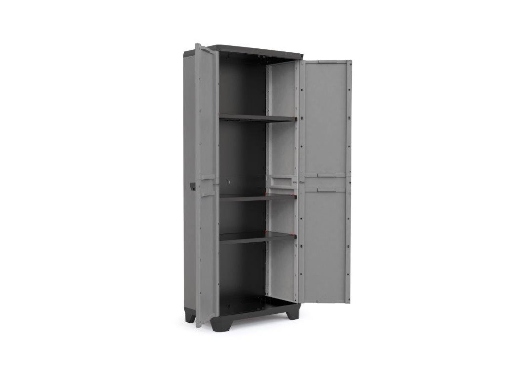 Vysoká skriňa Keter Stilo je určená na každodenné použitie, keď potrebujete prehľadne uložiť rôzne náradie, vybavenie alebo zásoby. Vďaka plastovej konštrukcii je ľahká a zároveň stabilná. Tri vnútorné police sa dajú výškovo nastaviť podľa vašich potrieb.