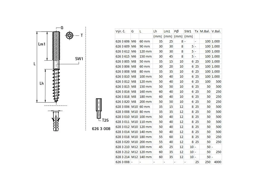 | 6263820 | M8 | 200 mm | 50 | 50 | 10 | 6 | 25 | 50 | 250 | ks | 54.50 |