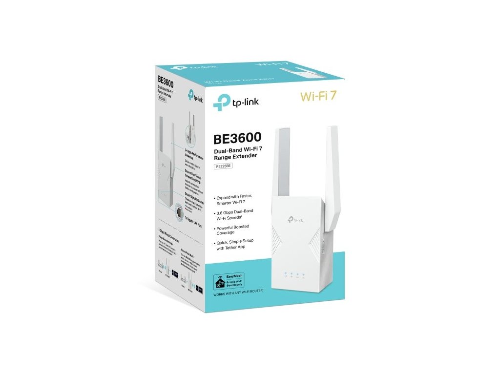 WiFi extender TP-Link RE225BE WiFi 7 AP/Extender/Repeater, BE3600, 1x GLAN, pevná anténa, EasyMesh, 52449718