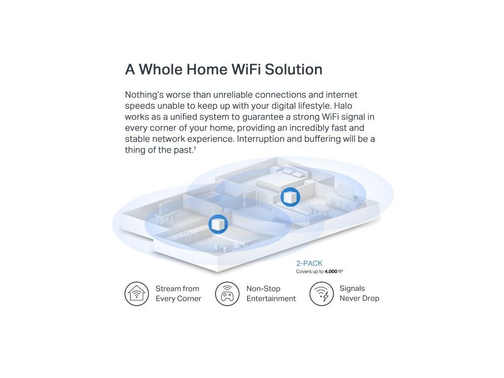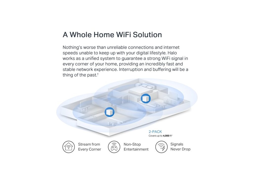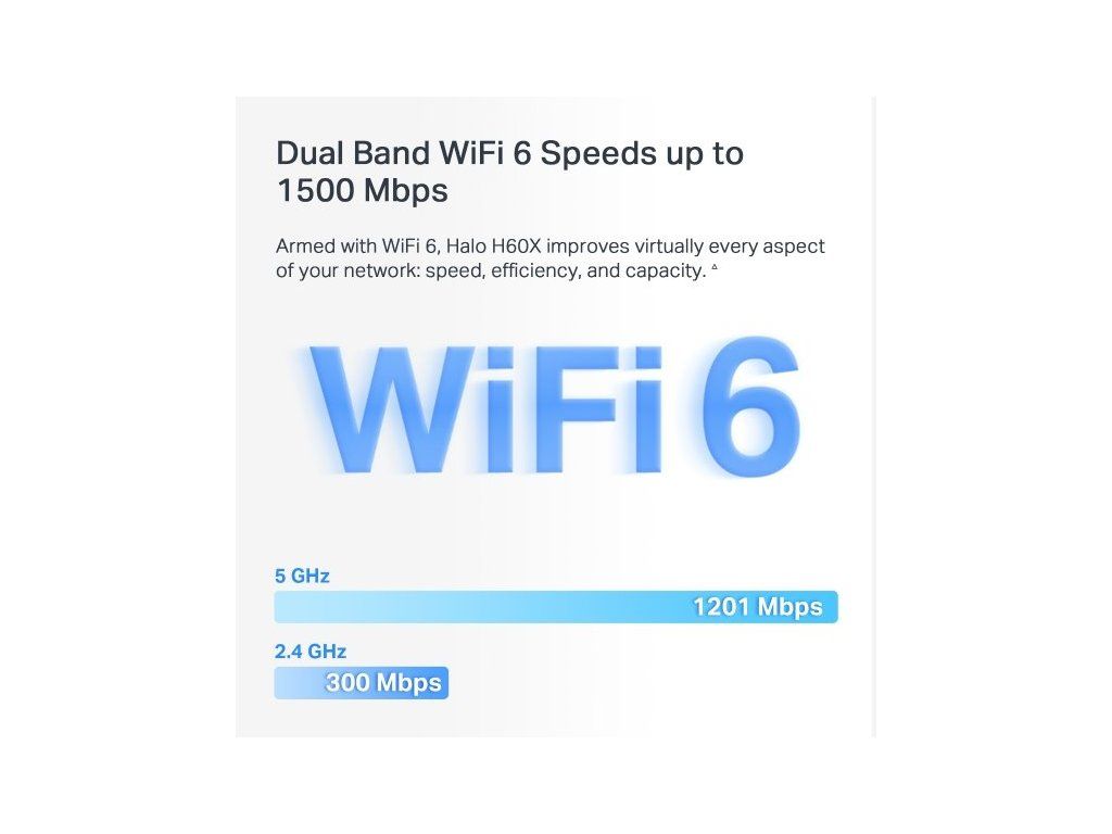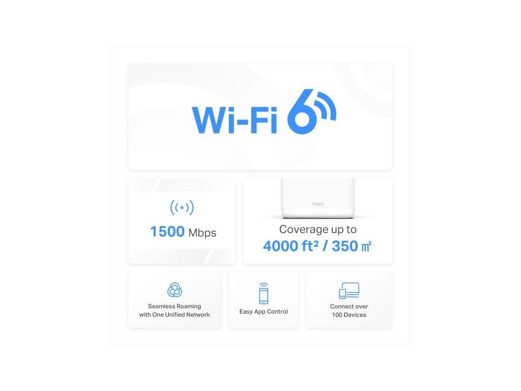 Získajte prístup k dvojpásmovej WiFi 6 s rýchlosťou až 1 201 Mb/s na frekvencii 5 GHz a 300 Mb/s na frekvencii 2,4 GHz. Výkonné zosilňovače signálu zabezpečujú silné a stabilné pripojenie Wi-Fi. Technológia tvarovania lúča sústreďuje signál priamo do zariadenia. Jednotky Halo vám jednoducho uľahčia prácu, ktorú potrebujete na získanie kvalitného internetu bez oneskorenia.