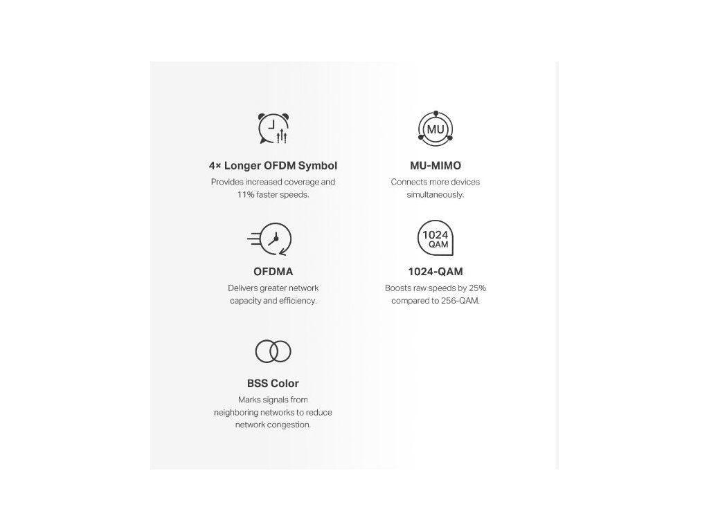 - Citlivosť príjmu: 2,4 GHz (11g 6 Mb/s: -96,5 dBm, 11g 54 Mb/s: -78 dBm), 5 GHz (11a 6 Mb/s: -96 dBm, 11a 54 Mb/s: -78 dBm, 11ac VHT20 MCS8:- 74.5 dBm, 11ac VHT40 MCS9: -70,5 dBm, 11ac VHT80 MCS9: -66,5 dBm, 11ax HE20 MCS11: -66 dBm, 11ax HE40 MCS11: -63 dBm, 11ax HE80 MCS11: -61 dBm)
