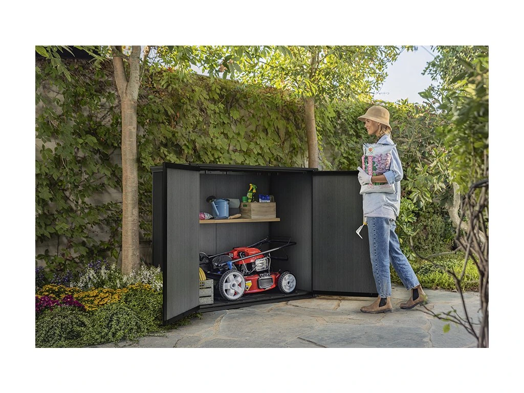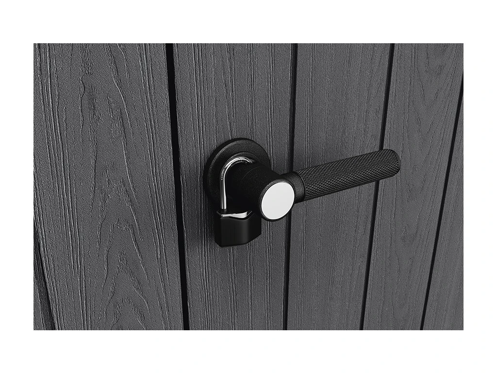 Záhradný box je vybavený dvojitými dvierkami s rukoväťou. Ľahko a bez námahy do neho môžete umiestniť aj väčšie predmety. Menšie predmety môžete prehľadne usporiadať na poličke (nie je súčasťou balenia). Pripevnite ho pomocou skrutiek, ktoré sú súčasťou boxu. Aby bolo všetko v bezpečí, box možno uzamknúť visiacim zámkom (nie je súčasťou balenia). Box je tiež vyrobený z technologicky vyspelého materiálu Evotech. Vďaka tomu má najlepšie vlastnosti plastov, takže odolá UV žiareniu a extrémnym zrážkam.